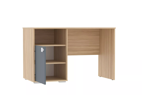 Письменный стол сочетает в себе функциональность и стиль. Он оснащен широкой рабочей поверхностью и встроенными полками с распашной дверкой. Стол может быть собран с секцией для хранения как на левую, так и на правую стороны. Высота полок фиксирована. При необходимости, стол может быть дополнен эргономичной и вместительной надстройкой из одноименной коллекции, чтобы создать полноценный рабочий уголок и сэкономить пространство в комнате ребенка.