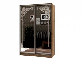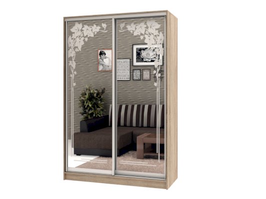Данное изображение представлено в следующих цветах: корпус - Дуб Сонома, фасады - зеркало с пескоструйным рисунком, рамка двери и треки - Серебро матовое.