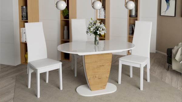 Столешница изготовлена из ЛДСП 16 мм и осветленного закаленного глянцевого стекла 4 мм, вставка выполнена из ЛДСП 22 мм. Модель имеет оригинальную скругленную форму опоры с белыми глянцевыми элементами из МДФ 4 мм по бокам. Плавные линии и креативное решение со вставками добавят кухне ноток оригинальности и эксцентричности. Основание изготовлено из МДФ 22 мм.