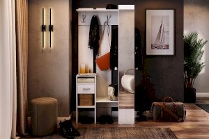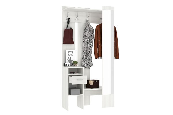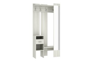 «Агата» создана для Вашей прихожей – Вы можете повесить одежду и сумку на металлические крючки, шляпки положить на полку сверху, нужные мелочи – в выдвижной ящик. На открытых полках можно разместить зонты, перчатки и шарфы. Лицевая панель с зеркалом во весь рост обеспечит комфорт и уют Вашей прихожей. «Агата» - стильная, функциональная, занимает минимум пространства.