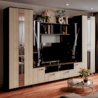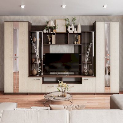 Гостиная Венеция – идеальный вариант для размещения большого количества вещей, включая одежду. ТВ-зона, выдвижные ящики и открытые полки гармонично вписаны в дизайн гостиной.