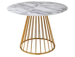 Стильный стол с металлическим основанием. Круглая столешница с рисунком белого мрамора выполнена из МДФ - прочного, экологически безопасного материала, который устойчив к перепадам температур и повышенной влажности. Поверхность столешницы декорирована рисунком белого мрамора, который идеально сочетается с металлическим основанием в золотом цвете. Защитные подпятники в основании предотвращают порчу напольного покрытия.