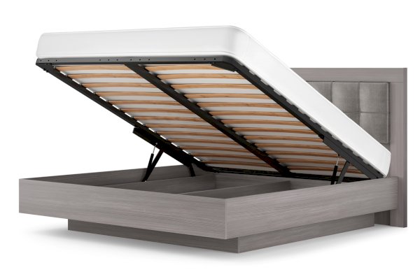 Изделие очень функционально благодаря подъёмному механизму и коробу для хранения несезонных вещей и спальных принадлежностей. Надежный газлифт с легкостью поднимает основание кровати, вам нужно потянуть за специальную петлю, чтобы он сработал.