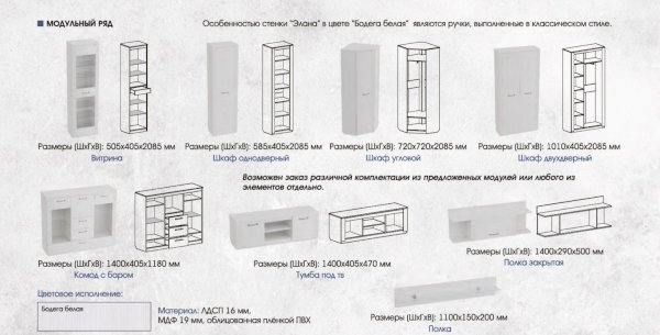 Модульная гостиная Элана Бодега белая (МБГ) - за 27 139 руб. в Петрозаводске. Купите на сайте petrozavodsk.onlinemarketmebeli.ru или по телефону 8(800)505-30-63 уже сегодня! Уточнить наличие, комплектацию, актуальную цену можно бесплатно у менеджера ежедневно. Закажите Модульная гостиная Элана Бодега белая (МБГ) до конца акции! Доступна покупка в кредит, рассрочку. Доставим со склада или на заказ.
