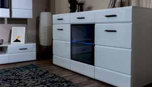 Модульная система Йорк выполнена в стиле минимализма. Строгие, лаконичные линии подчеркивают элегантность комплекта. Белый цвет мебели с деталями глубокого черного визуально сделает комнату светлее, просторнее и позволит составить безупречный по стилю комплект мебели. Сочетание глянцевой и стеклянной поверхностей, открытых полок создадут уютную обстановку и позволят украсить убранство комнаты приятными мелочами и разместить любимые книги и фото. Светодиодная подсветка придаст индивидуальность Вашей мебели. А широкая тумба для ТВ с выдвижными ящиками на телескопических направляющих позволит удобно разместить телевизор любой диагонали и другие медиаустройства Модульная система позволит подобрать по размеру вариант именно для Вашей комнаты, не оглядываясь на фиксированный размер, как в других стенках. Мебель выполнена из экологически безопасных материалов.
