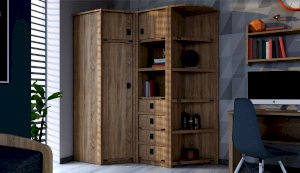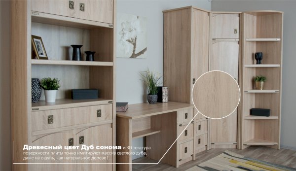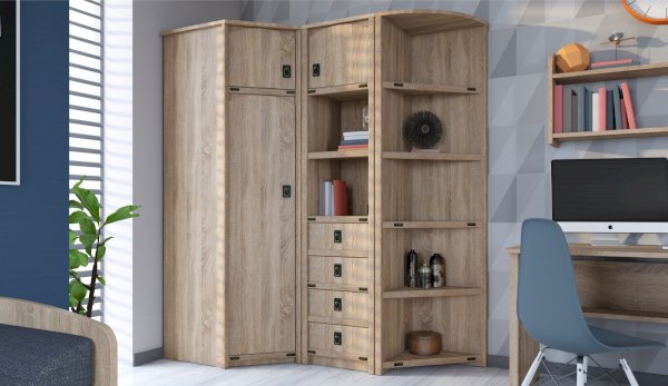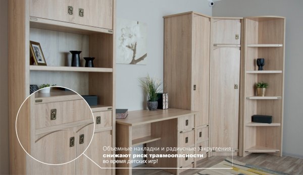 Угловой шкаф позволяет рационально использовать пространство и хорошо будет смотреться даже в небольшой комнате, его можно поставить со шкафами и пеналами разной глубины. Декоративные накладки и профиль из МДФ по вертикальным краям закрывают острые края корпуса и придают шкафу более эффектный и надежной вид. Стилизованные металлические ручки MARINE бронзового цвета и декоративные элементы в тон – это изюминка шкафа Валенсия. Идеально компонуется со всеми модулями системы Валенсия.