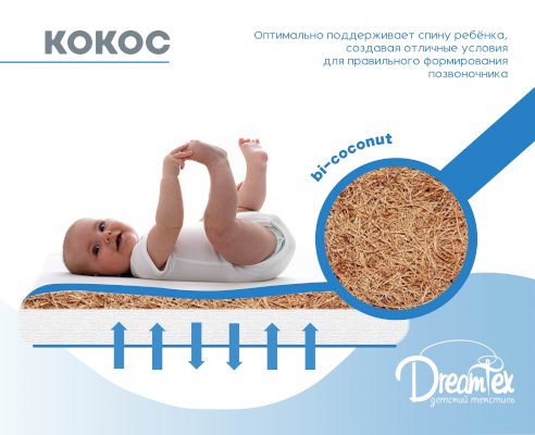 Идеально подходит для большой трансформации кроватки Dreams Smart. Трехслойный матрас позволяет регулировать жесткость спального места, а натуральные материалы (кокос, латекс) создадут оптимальный ортопедический эффект от эксплуатации. Кокосовая койра – качественный, натуральный, износостойкий материал, используемый в матрасном производстве в качестве жесткого наполнителя. Натуральный латекс – это природный материал, переработанный сок каучукового дерева. Данный материал экологически чистый, упругий и долговечный. Латекс обладает антибактериальными свойствами, не накапливает влагу, отлично дышит. Упругая структура наполнителя дает отличный ортопедический и анатомический эффект.